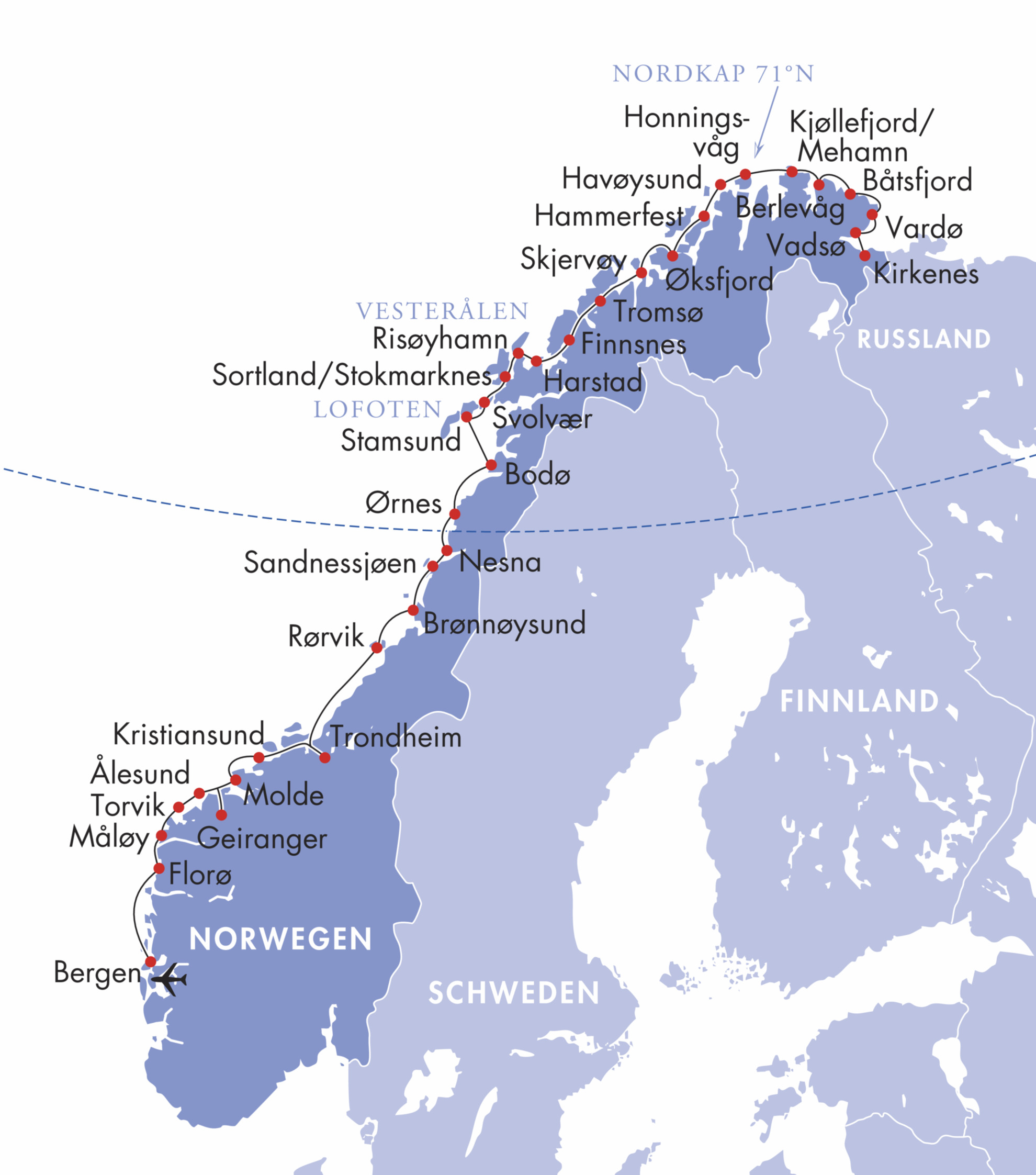 HURTIGRUTEN Postschiffroute nordwärts: Bergen – Kirkenes